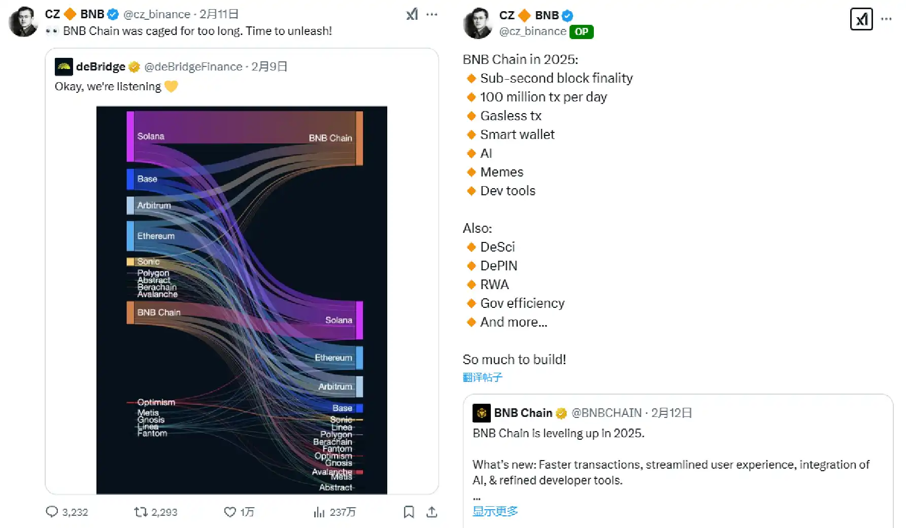 作为 Binance 的创办者以及最大的股东,CZ 的一言一行都有可能影响着市场的情绪和走势。最近,CZ 在 Twitter 上不断为 BNB Chain「站台」,在 Binance 上线 BNB Chain 的 Meme 币,强调 BNB Chain 的技术优势与生态潜力,勾画 2025 年发展蓝图,引发市场广泛关注。在 CZ 的推动下,BNB Chain 生态代币迎来普涨,创下年内新高。
