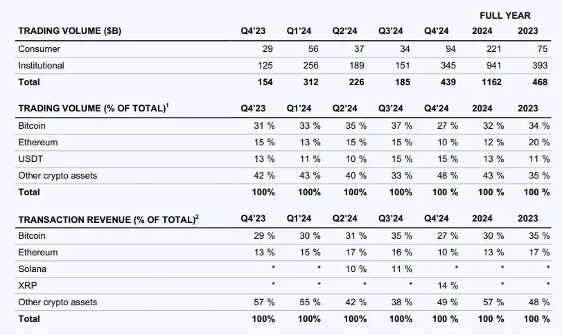 2024 全年交易收入为 40 亿美元,同比增长 162%;总交易量为 1.2 万亿美元,同比增长 148%。其中散户交易量为 2210 亿美元,同比增长 195%;机构交易量为 9412 亿美元,同比增长 139%。而在第四季度,Coinbase 的交易收入达到 16 亿美元,环比增长 172%;交易量为 4390 亿美元,同比增长 185%。
