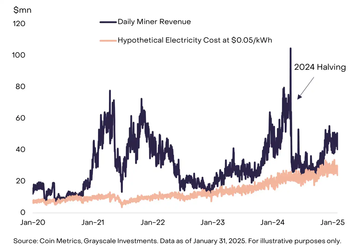 图 3:矿工运营利润率反映了区块奖励与电力成本之间的差距