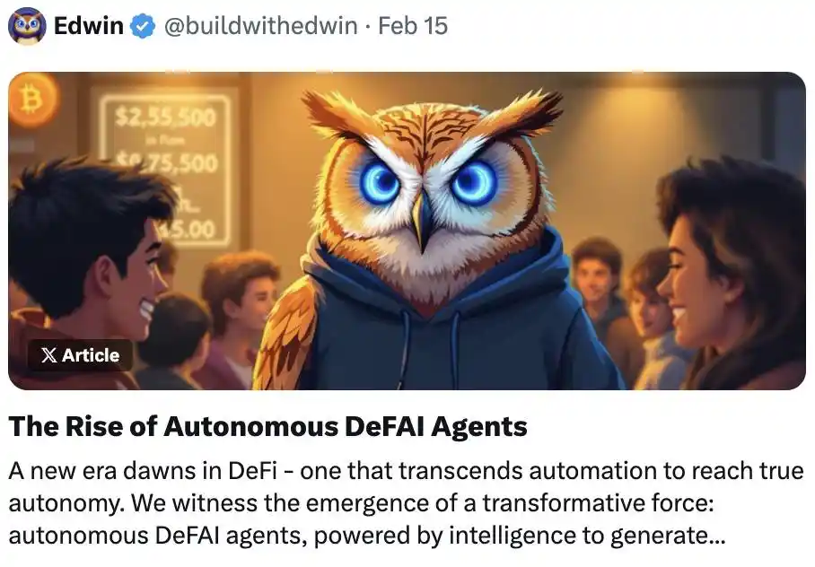 Edwin 是一个基于 TypeScript 的基础设施,旨在支持 AI 智能体与 DeFi 协议交互。通过 Edwin,用户可以创建 DeFAI 智能体,用于流动性提供(LP'ing)、借贷操作以及跨链交互等。