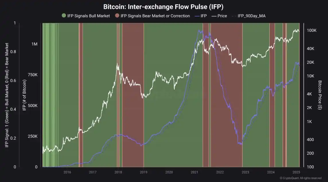 根据链上分析师 Maartunn 的分析,比特币的交易所间流动脉冲(IFP)已转为负值,表明潜在投资者的风险偏好有所下降。IFP 指标衡量的是现货和衍生品市场之间的比特币流动。历史数据显示,当市场上行且投资者情绪高涨时,更多比特币会从现货转移到衍生品市场。而当市场走弱时,比特币则会从期货市场流出,流入现货交易所,显示出投资者对价格下行的预期。