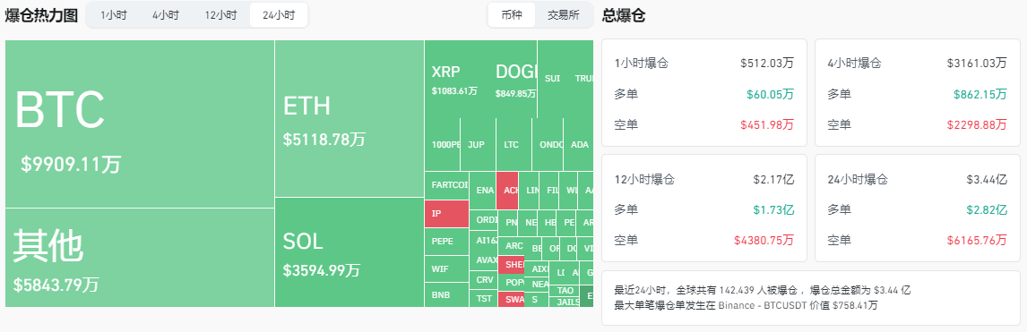 14 小时的剧烈波动让衍生品市场陷入血雨腥风。根据 Coinglass 的数据显示,过去 24 小时内,全球有 142,439 名投资者爆仓,爆仓金额高达 3.44 亿美元。市场的剧烈震荡引发了投资者的恐慌,同时也暴露了加密货币市场的脆弱性。