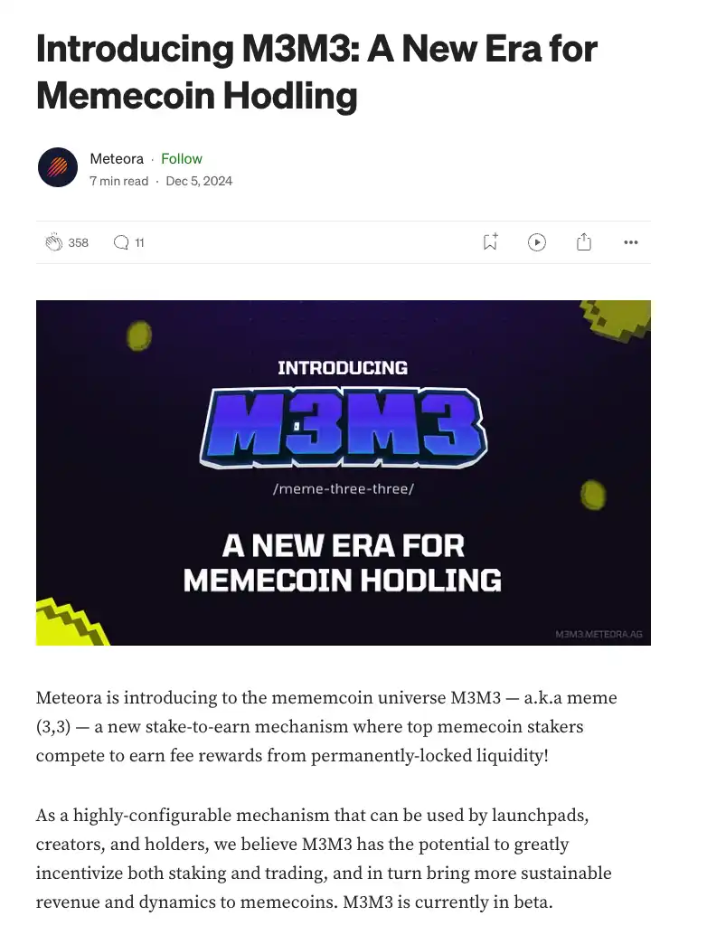 因此这也不难理解 2024 年 12 月 5 日,Meteora 的一个博客突然介绍了 M3M3 Launchpad 这个项目。