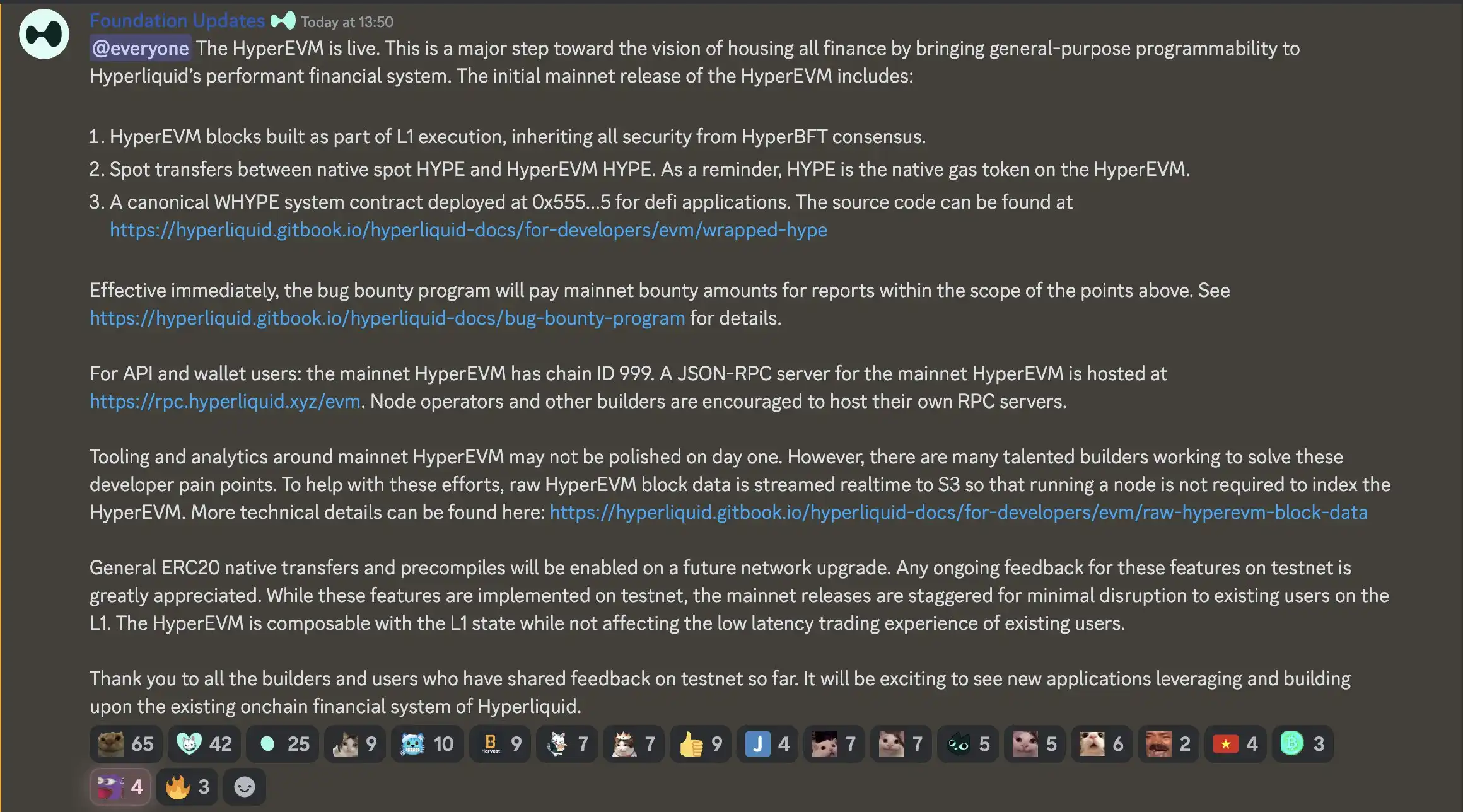 就在这时,去年 TGE 之后就开启以涨服人之路的 Perp DEX 突然在这个微妙的时间节点,官宣 HyperEVM 主网上线。不得不说,这一个月来市场呈现的病态疲软,实在太需要出现一个有实力真正 build 加密世界的高质量项目了。HyperEVM 如同「踩点大师」一般选择此时上线,迅速引起了高度讨论和关注。