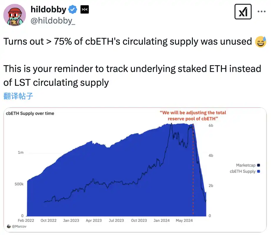 据透露,超过 75% 的 cbETH 流通供应量实际上并未被使用。这一发现提醒我们,应当关注底层质押的 ETH,而非仅仅关注 LST(流动性质押代币)的流通供应量。如果我们能够追踪到支撑 cbETH 的质押 ETH,cbETH 可能会更加成功,但他们没有选择透明化,而是通过未使用的供应量来膨胀 cbETH 的数量。