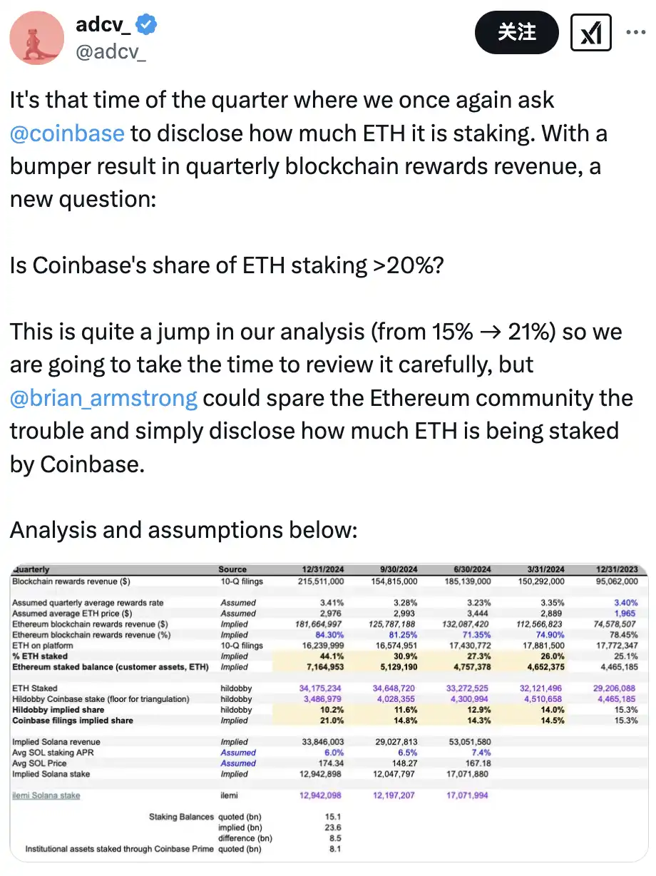 X 用户@adcv_估计过去几个季度质押 ETH 的恒定比例约为 15%,最近增加了 6%,并作出分析这可能与 Coinbase Custody 有关。