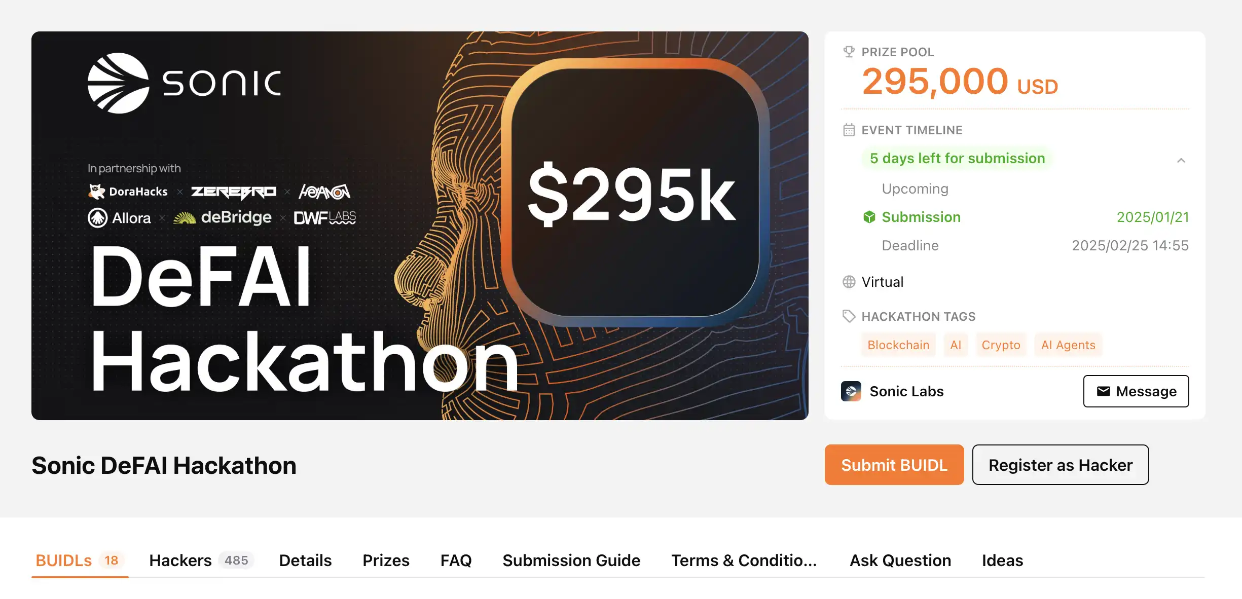 此次黑客马拉松的奖金为 29.5 万美元等值的 $S,为在 Sonic 构建执行社交和链上操作的 AI 代理提供支持。现已吸引了 18 个 AI 项目以及 485 个技术人员关注,报名截止日期为 2 月 25 号。