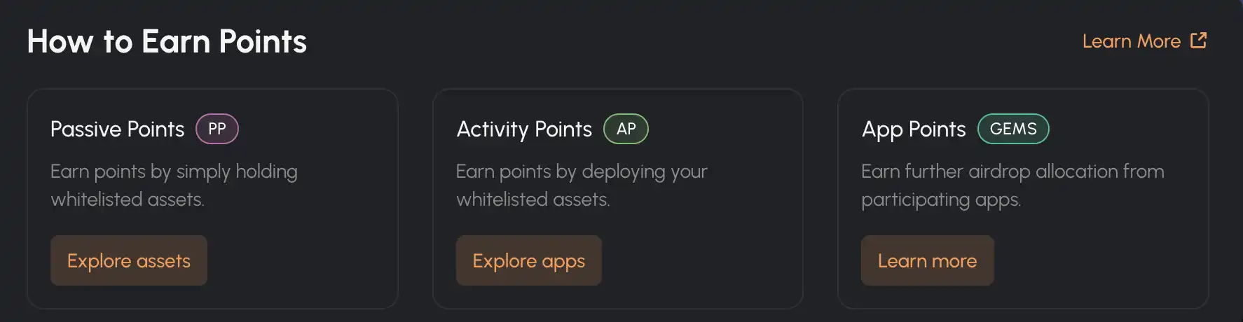 现在获得空投的凭证为积分,共有三种空投积分:被动积分「PP」只需要在 Web3 钱包中持有白名单资产。活动积分「AP」需要在参与项目中提供白名单资产作为流动性。DApps 积分「Gems」生态开发者对生态的贡献可获得「Sonic 宝石」的分配额度