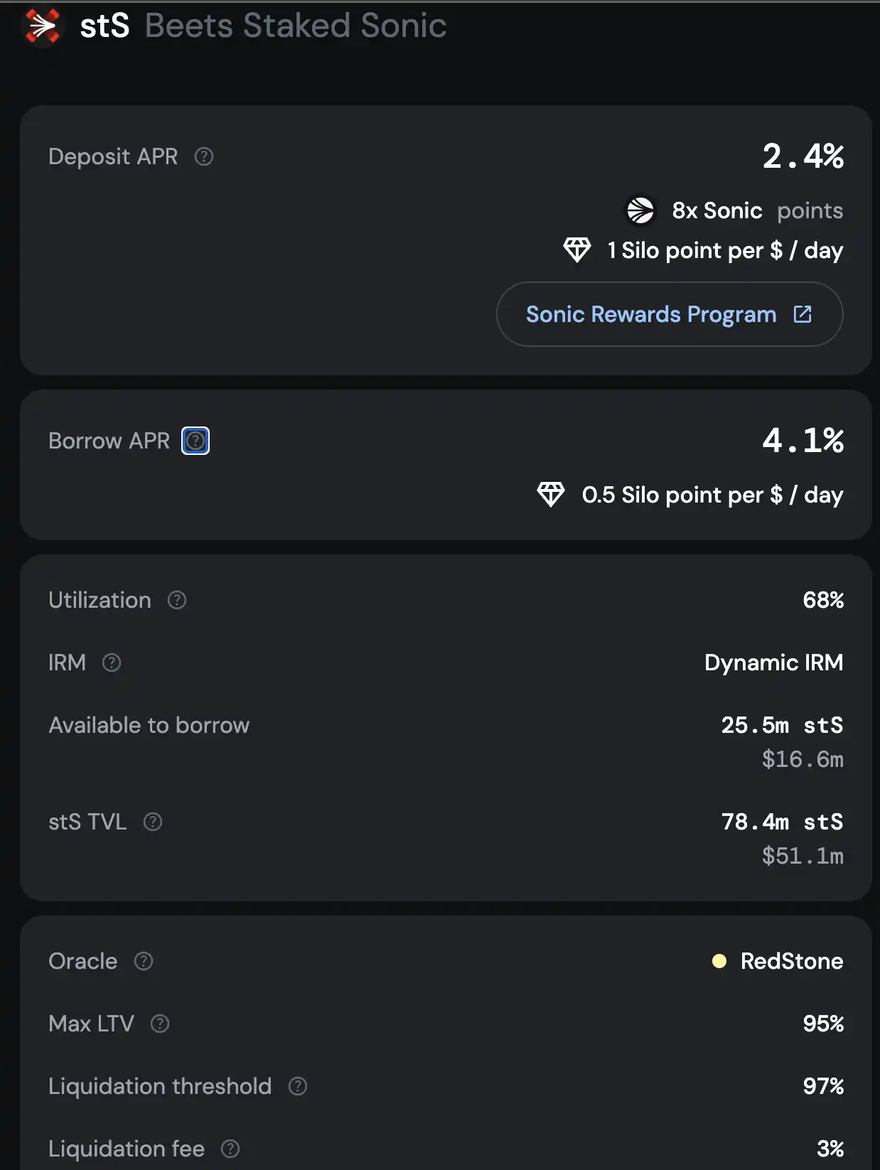 在 Silo Finance 上借入 stS 代币,获取 8 倍的积分加成。随后将 stS 代币出借,获得 4.1% 的出借收益。而每日能获得 0.5 个 Silo 积分的加成。该策略的基础收益为 4.1% 和每日 0.5 个 Silo 积分的奖励,虽然收益不高但优相对的风险也更小。