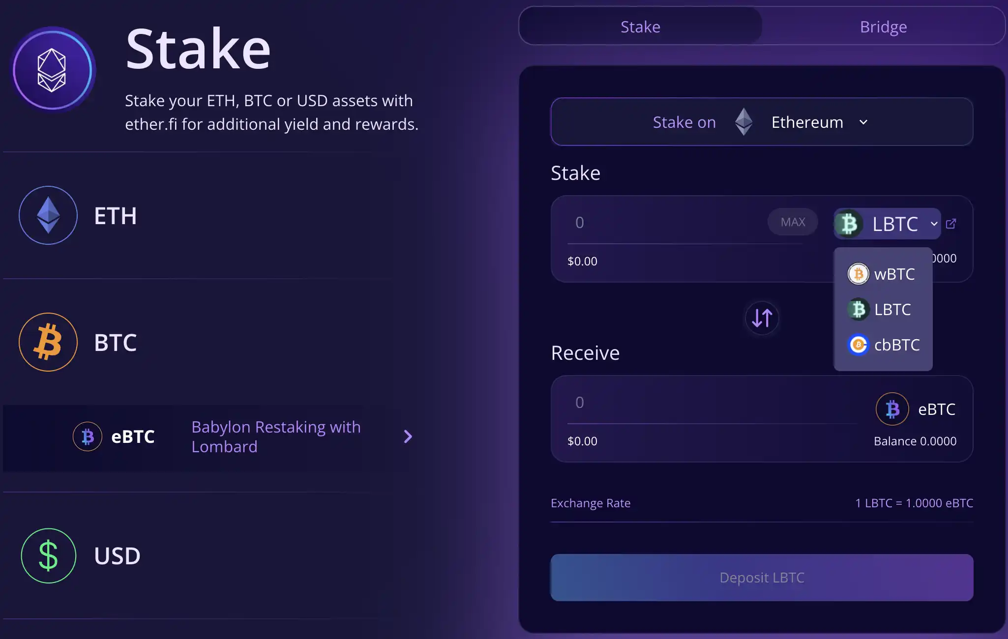 进攻的起始点是 Lombard Finance,Lombard 是专注于比特币的 DeFi 项目,最著名的产品是推出了 LBTC,一种流动质押的比特币版本。用户通过 Lombard 质押在 Ethereum, Base 或 BNB 上的 BTC,用户会收到 1:1 的「LBTC」。