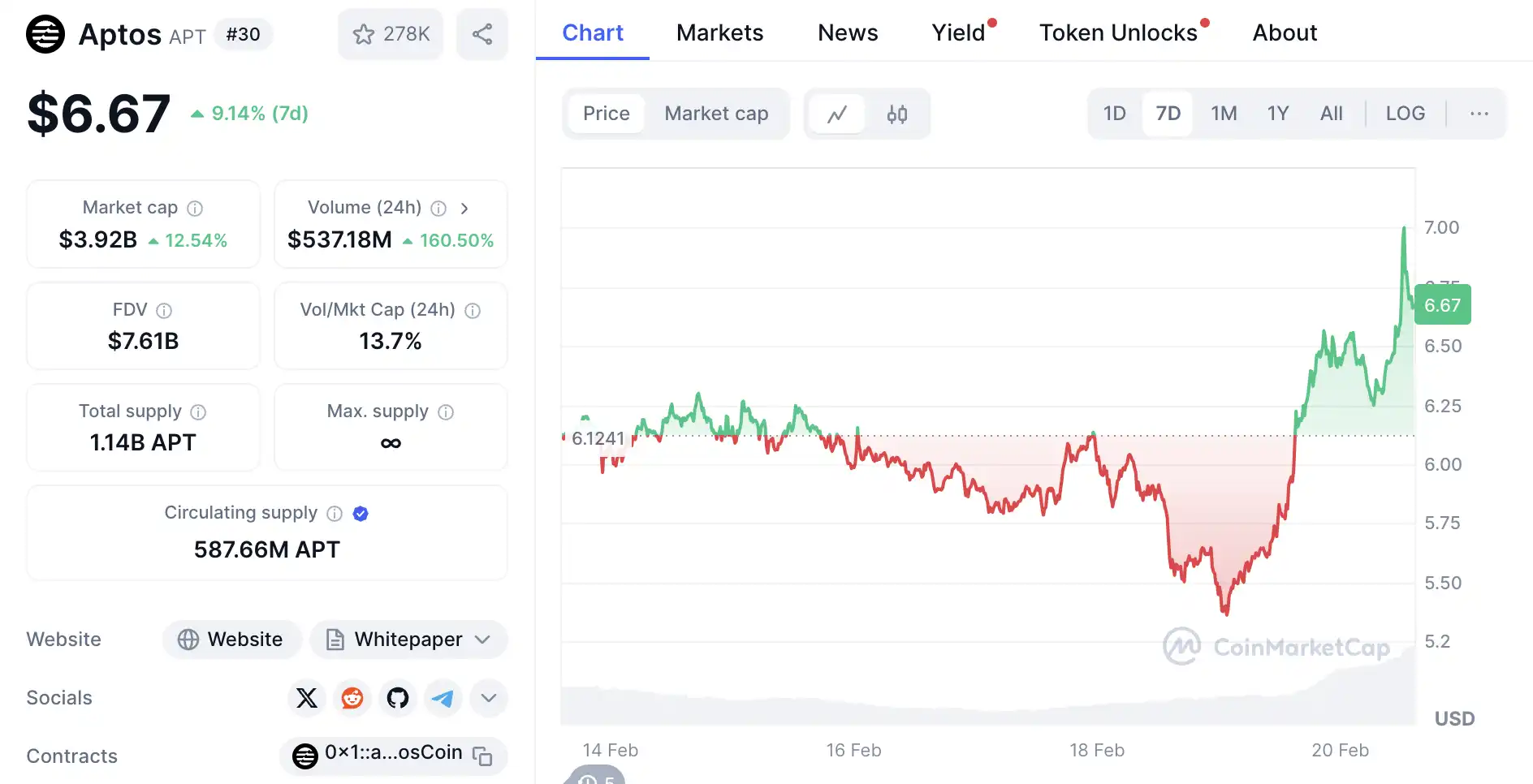 反观 Aptos,研究主管 Spiegelman 选择在测试网当天发起指控,或许有市场竞争的考量。尽管到底谁才是技术原创尚无定论,Aptos 这次选择在 Monad 收获大波流量时发起进攻显然收获了成效。在社区吃瓜围观的过程中,Aptos 的原生代币 APT 表现出强劲的价格上涨。截至撰稿时,根据行情数据,过去 24 小时内 APT 涨幅达 7%,短时触及 7 美元。