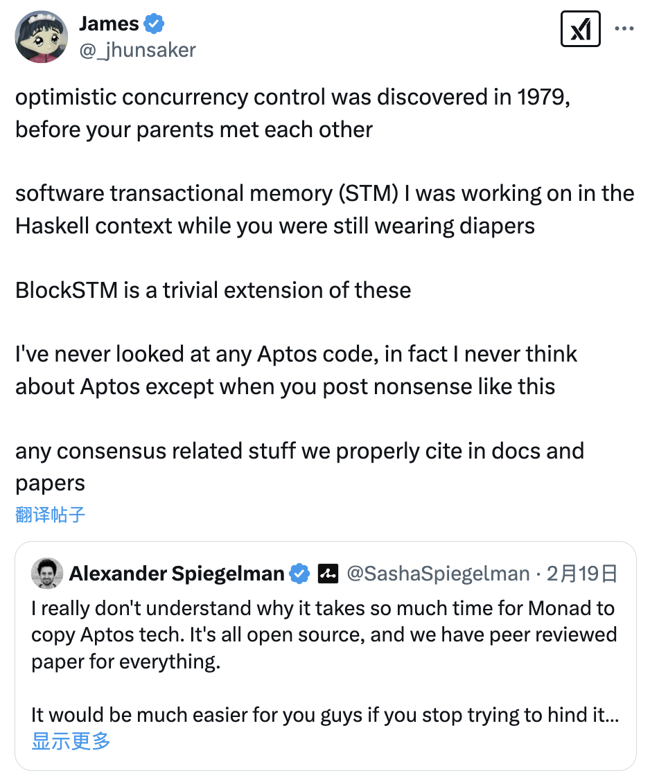 时间正值 Monad 的大日子,联创 James Hunsaker 自然是忍不了有人来坏好事,直接在评论区回击:「乐观并发控制(OCC)是在 1979 年发现的,那时你父母还没见面。我很早已经在 Haskell 环境中研究软件事务内存(STM)了,当时你还在穿尿布。BlockSTM 是这些东西的简单扩展。我从来没有看过任何 Aptos 代码,事实上如果不是你发布这些无稽之谈,我都想不到 Aptos。任何与共识相关的内容,我们都会在文档和论文中正确引用。」