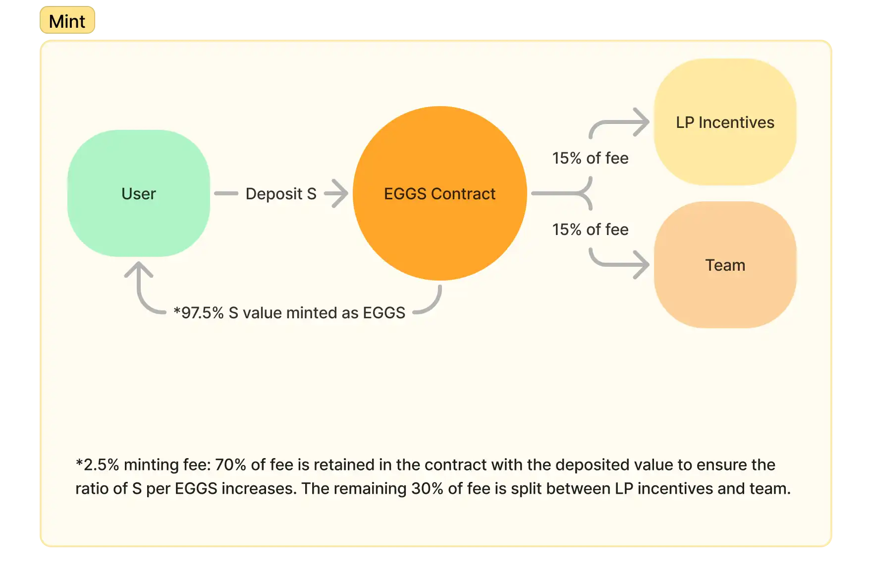 Eggs Finance 是基于 Sonic 区块链构建的 DeFi 协议。用户可以通过将 S 存入协议的智能合约来铸造 EGGS,每笔铸造交易需支付 2.5% 的费用,EGGS 供应量上限为 1000 亿枚。