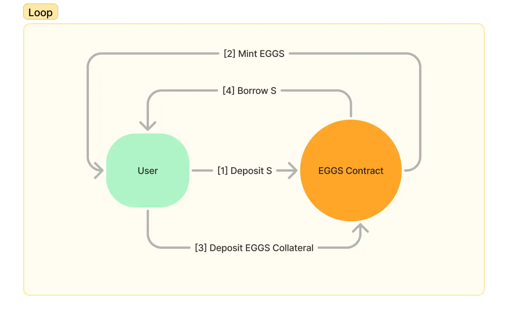 因此,用户可以利用以上规则给自己的仓位加杠杆:利用自己持有的 S 代币铸造出 EGGS 代币,再用铸造出的 EGGS 作为抵押借入 S,在使用借来的 S 铸造或购买更多的 EGGS,并循环此过程,以不断获得更多的代币。