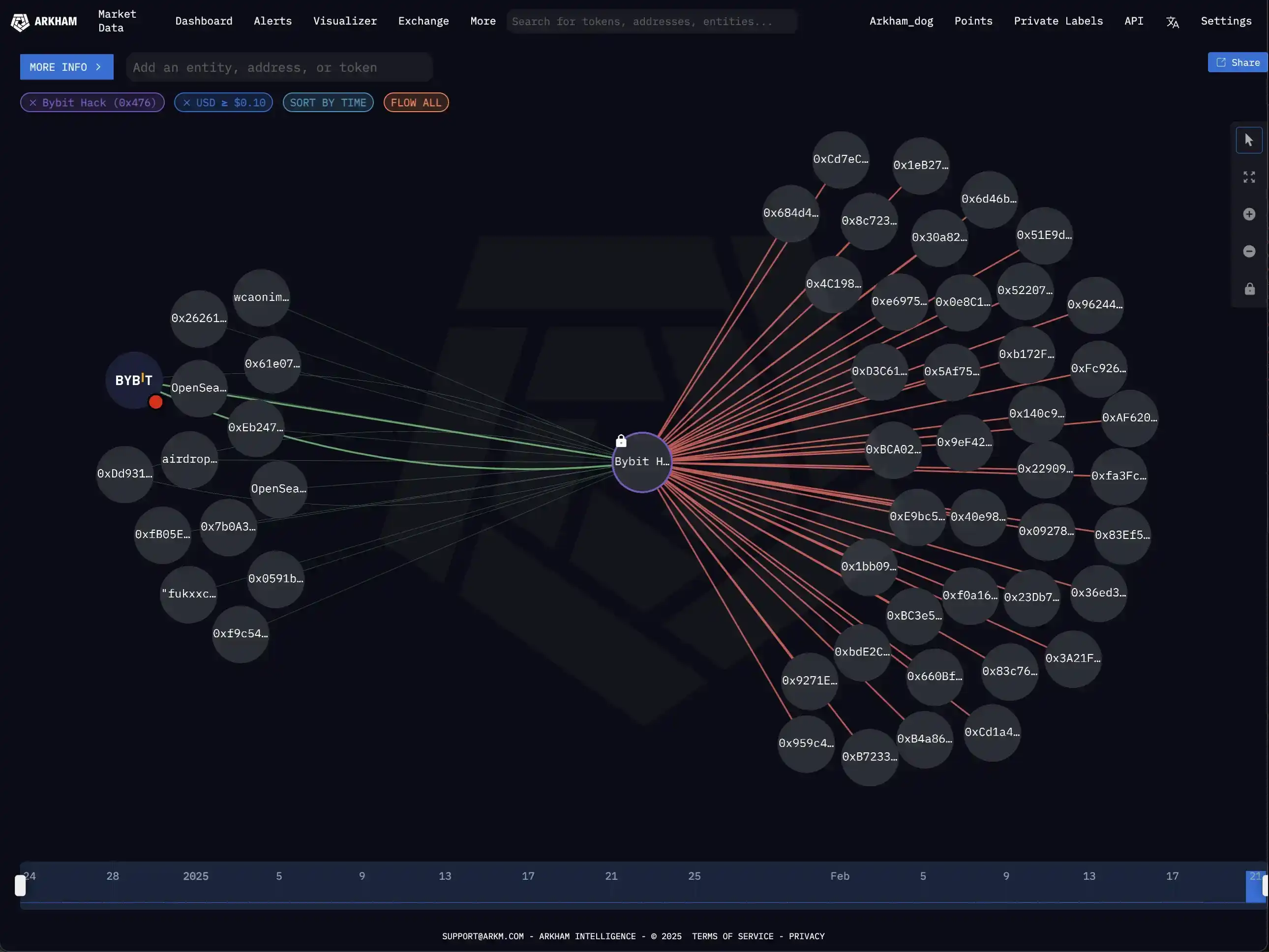 23 时 57 分,据 Arkham 监测,Bybit 黑客已开始向多个地址分散资金。