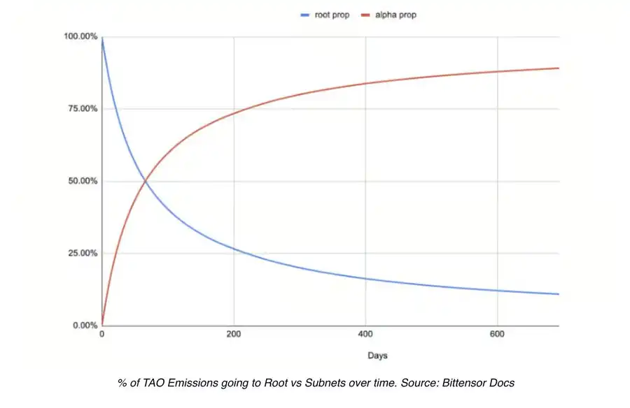 大约 100 天后,Root 质押者获得的 TAO 奖励预计将与子网 Alpha 代币达到平衡。