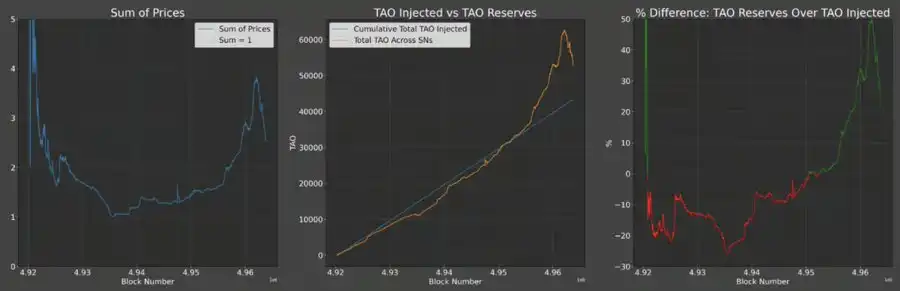 每个区块,协议会扫描所有子网的 Alpha 代币价格,并动态决定向每个子网的池中注入多少新铸造的 TAO。