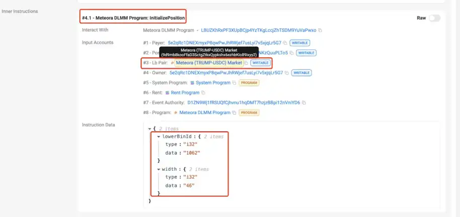 在交易详情页面往下查看,在【#4.1 - Meteora DLMM Program: initializePosition】 可以知道 lowerBinId 为 1062,bin 的宽度即个数为 46,池子地址为 9d9mb8kooFfaD3SctgZtkxQypkshx6ezhbKio89ixyy2,如图。由以上信息可以计算出 upperBinId=lowerBinId + widh - 1 =1062+46-1=1107