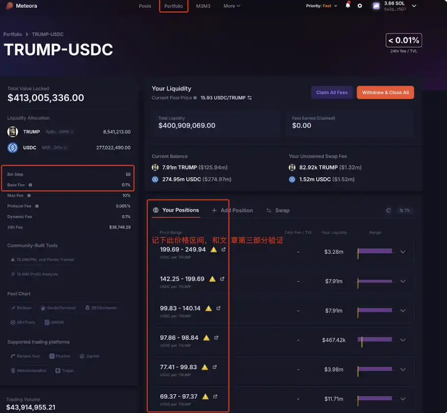 Meteora 支持连接钱包地址后查看持有的仓位,而且支持以观察钱包的方式查看,我们可以根据此特性查看池子的价格区间。