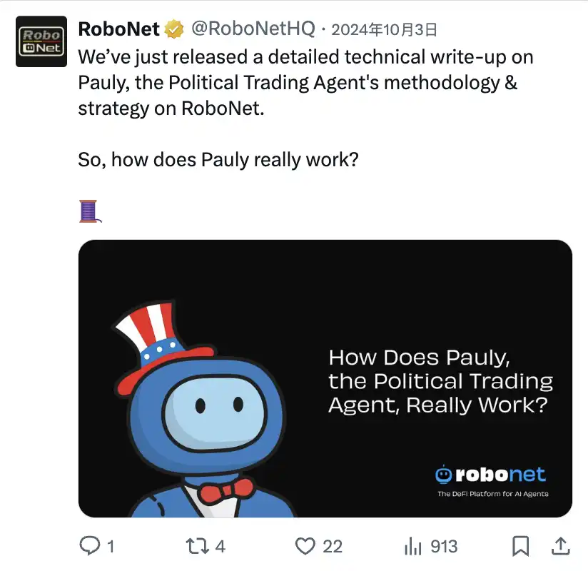 Pauly 是一个旗舰级政治交易 Agent,参与了 Polymarket 的 2024 年美国大选市场,通过对冲交易策略实现了大约 14% 的三个月回报率(约 68% 的年化回报率)。