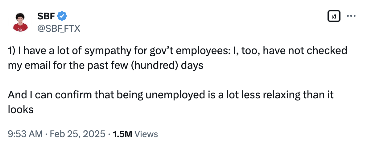 在 SBF 的复出推文中,他核心表达了一件事是「解雇员工是世界上最困难的事情之一」,这让人不由得联想到特朗普的美国政府效率部(DOGE),其上任后干得最多的一件事便是解雇政府官员。就连 SBF 案的检察官也因为「新官上任三把火」而辞职,因为司法部要求她暂停对纽约市长 Eric Adams 的腐败调查。