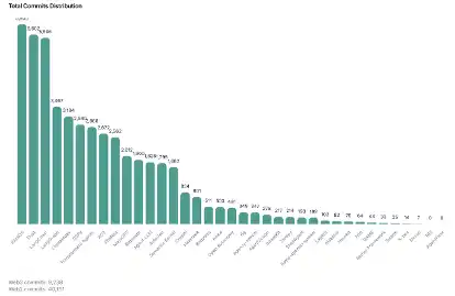 在代码提交分布方面。Web2 项目的提交量也明显高于 Web3 项目。Web3 项目的总提交次数为 9,238 次,而 Web2 项目则高达 40,151 次,表明 Web2 项目的开发活跃度更高,更新频率较为稳定。代码提交量排名前三的项目是:ElipsOS 以 5,905 次提交领跑;紧随其后的是 Dust,共提交了 5,602 次代码;LangChain 排名第三,提交次数为 5,506 次。