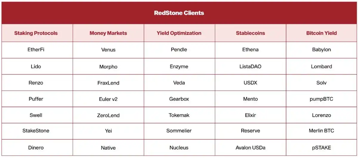 该平台在可靠性方面的声誉继续吸引着 DeFi 的主流参与者。其中知名的合作伙伴包括为 Spark(Maker 的借贷协议)获得 30 亿美元 TVS,以及为 Pendle,Ethena 等 DeFi 领导者以及各种 BTC 质押、收益稳定币、LST 和 LRT 等提供价格反馈,其客户名单也反映了业界对 RedStone 可靠和可定制的预言机解决方案的信心。