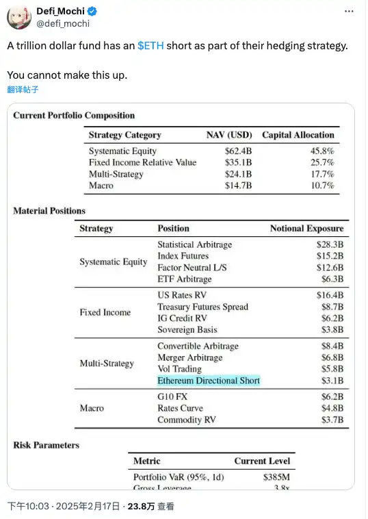 最近,一份神秘机构的资产配置表流了出来,令人值得注意的是,在「多策略」投资组合中赫然标注着一份「31 亿美元的以太坊空头资产」。