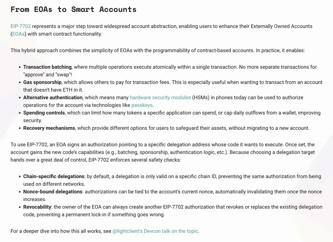 EIP-7702 在协议层面使以太坊更接近账户抽象的体验。它通过为以太坊的外部拥有账户(EOAs)扩展智能合约功能来实现这一点,功能包括: