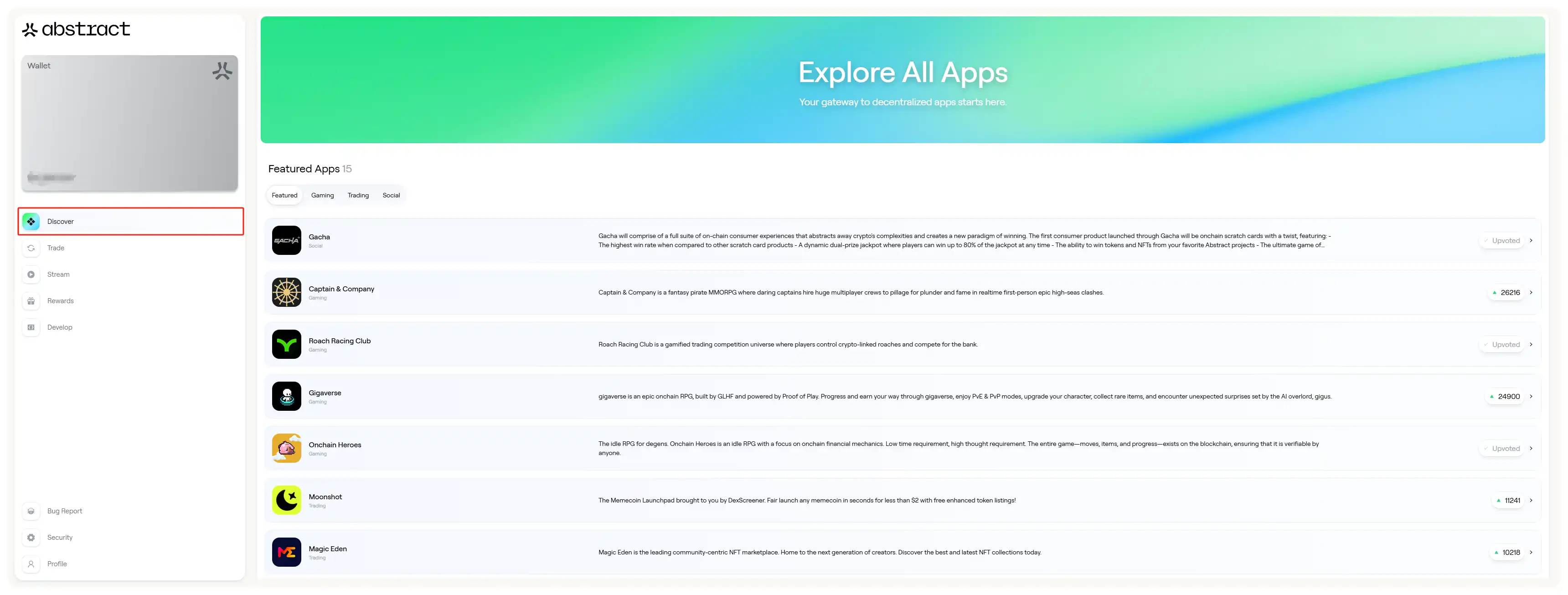 注册完成后,点击网页左边导航栏的「Discover」,然后下拉页面,就可以看到 Abstract 整理好的生态内 dApp 列表。