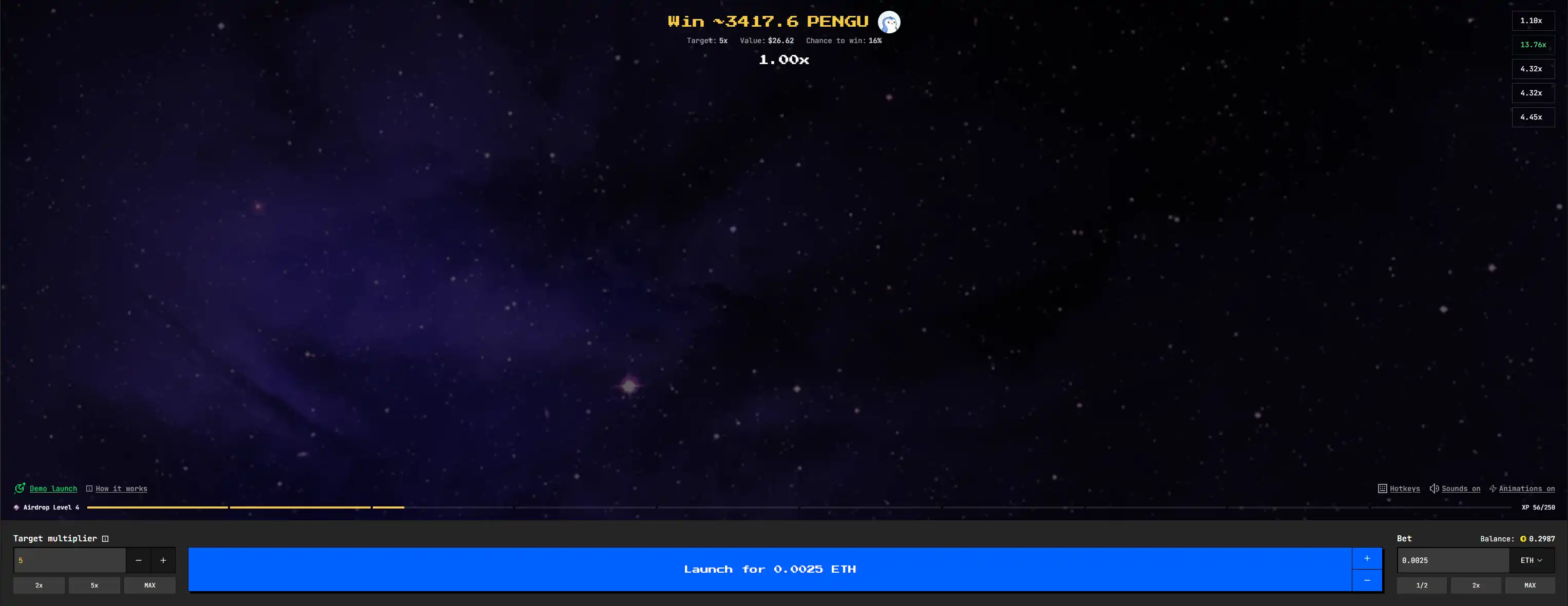 市场「绿蜡烛」制造机。你可以选自己喜欢的小市值 meme 币,然后选定一个倍数,把 ETH 赌进去。如果最后系统给出的倍数小于你选的倍数,那么你的 ETH 项目方收了,给你的是项目自己的代币。反之,系统就会动用金库去买对应的 meme 币,交还 (你赌进的金额 * 倍数) 等量的 meme 币。