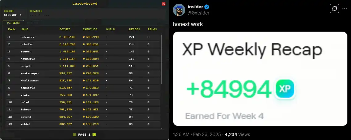 比如目前的生态头牌项目 On-chain Heroes 的榜一大哥 @0xtsider 在上周就得到了 84994 XP 奖励,而目前想要参与 On-chain Heroes,就必须至少花 0.5 ETH 购买一个 NFT 进入游戏内质押。