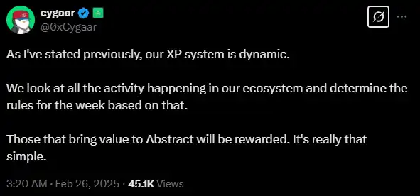 这个猜测得到了印证。根据 Abstract 团队成员 @0xCygaar 的说法,Abstract 的 XP 分配是团队对生态内各项目的活跃情况进行观察后,每周进行动态调整的。