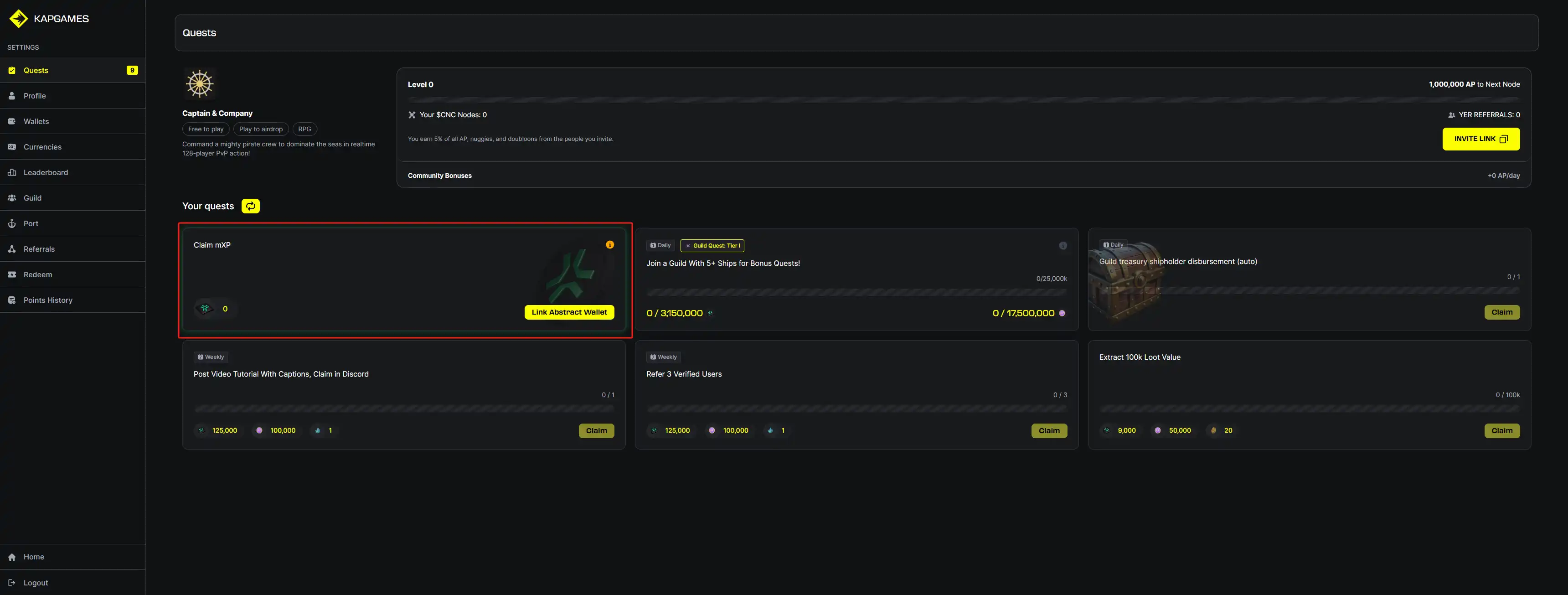 这个游戏的日常任务并不显示在游戏内,而是在游戏平台 kap.gg 的个人资料页面中的「Quest」部分展示。如果您想通过该游戏交互获得 Abstract XP,一定要先在 kap.gg 的个人资料页面中的「Quest」部分关联您的 Abstract Global Wallet,然后再去游戏里做任务。