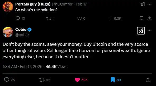 我最近看到有人问 Cobie,鉴于所有关于模因币的「飞蛾般」的堕落,他们应该做什么。我认为他的回答非常精彩: