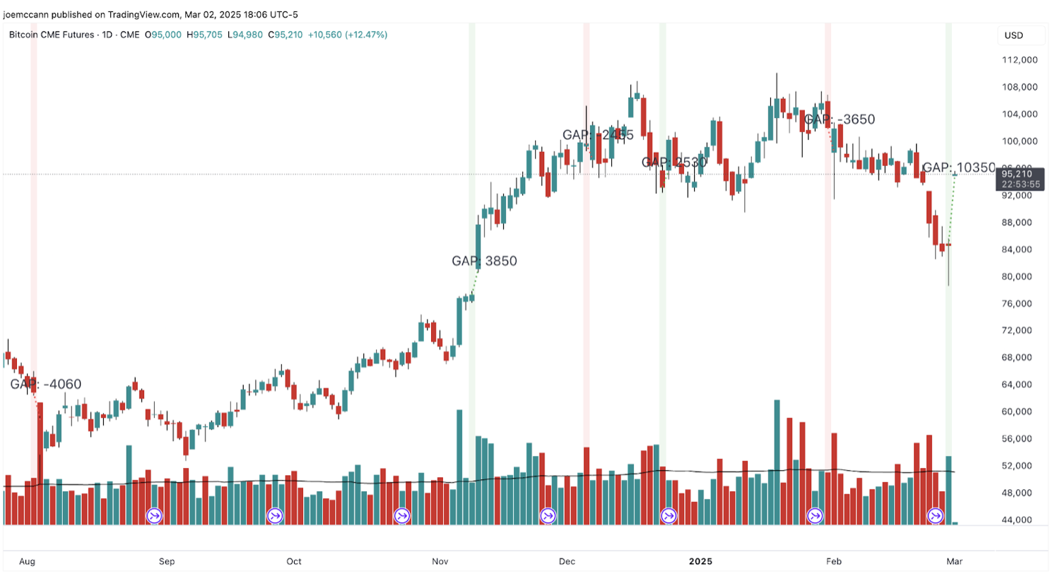 根据 TradingView 数据,特朗普宣布后,现货市场瞬间涌入超过 3,000 亿美元,推动比特币价格在几小时内从 85,000 美元 飙升至 接近 95,000 美元,并造成 CME 期货出现 10,000 美元的巨大缺口。这一纪录大幅超越了 2024 年 8 月的 4,000 美元 先前最高纪录。