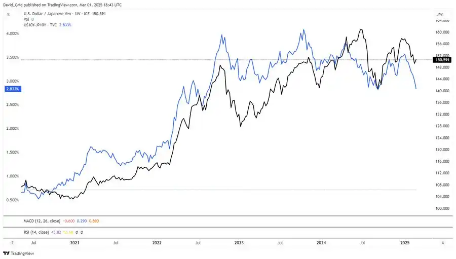 反驳 5:现实世界证明这一点不成立。看看常规货币的定价方式就知道了。一种外汇货币相对于另一种货币的升值,通常是基于利率差异。相对较高的利率会导致货币更强劲。这里有一张美元/日元与美国 10 年期国债和日本 10 年期国债利差的图表作为例子。