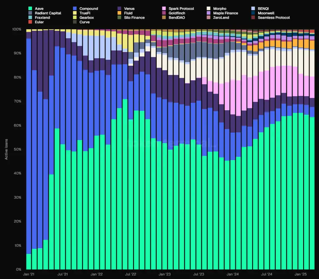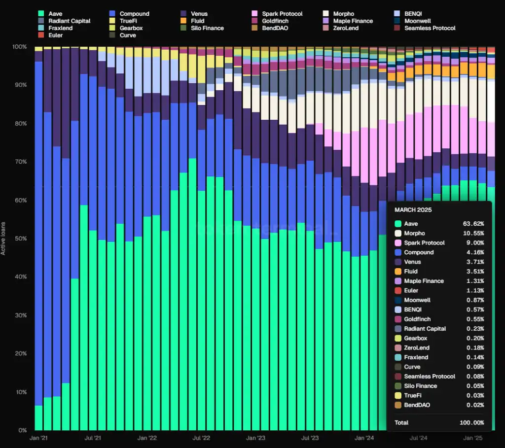 从贷款规模(EVM 链)来看,Aave 的市场占有率一直比较稳定,自 2021 年 6 月之后始终占据市场第一名。在 2023 年下半年,其市场份额一度跌破 50%,但从 24 年开始重拾升势,目前基本稳定在 65% 左右。