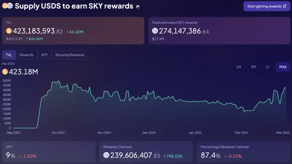 此前 MakerDAO 进行品牌升级的其中一个原因,就是其已经没有多余的 MKR 储备能对其业务的新增进行激励了。目前,MakerDAO 的代币激励主要用于激励 USDS 的存入,从 2024 年 9 月份底上线激励计划至今的 5 个月内,一共有 2.74 亿枚 SKY 激励释放,约合 1740 万美元,年化的激励金额为 4200 万美元左右。