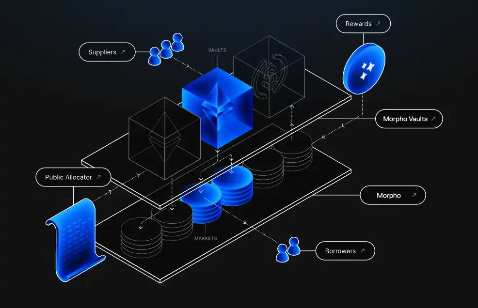 Morpho 的初始产品,旨在提升现有 DeFi 借贷协议(如 Aave 和 Compound)的资本效率。通过将用户资金存放在这些平台上并赚取基础收益,同时根据借贷需求进行点对点资金匹配,优化资金使用效率。