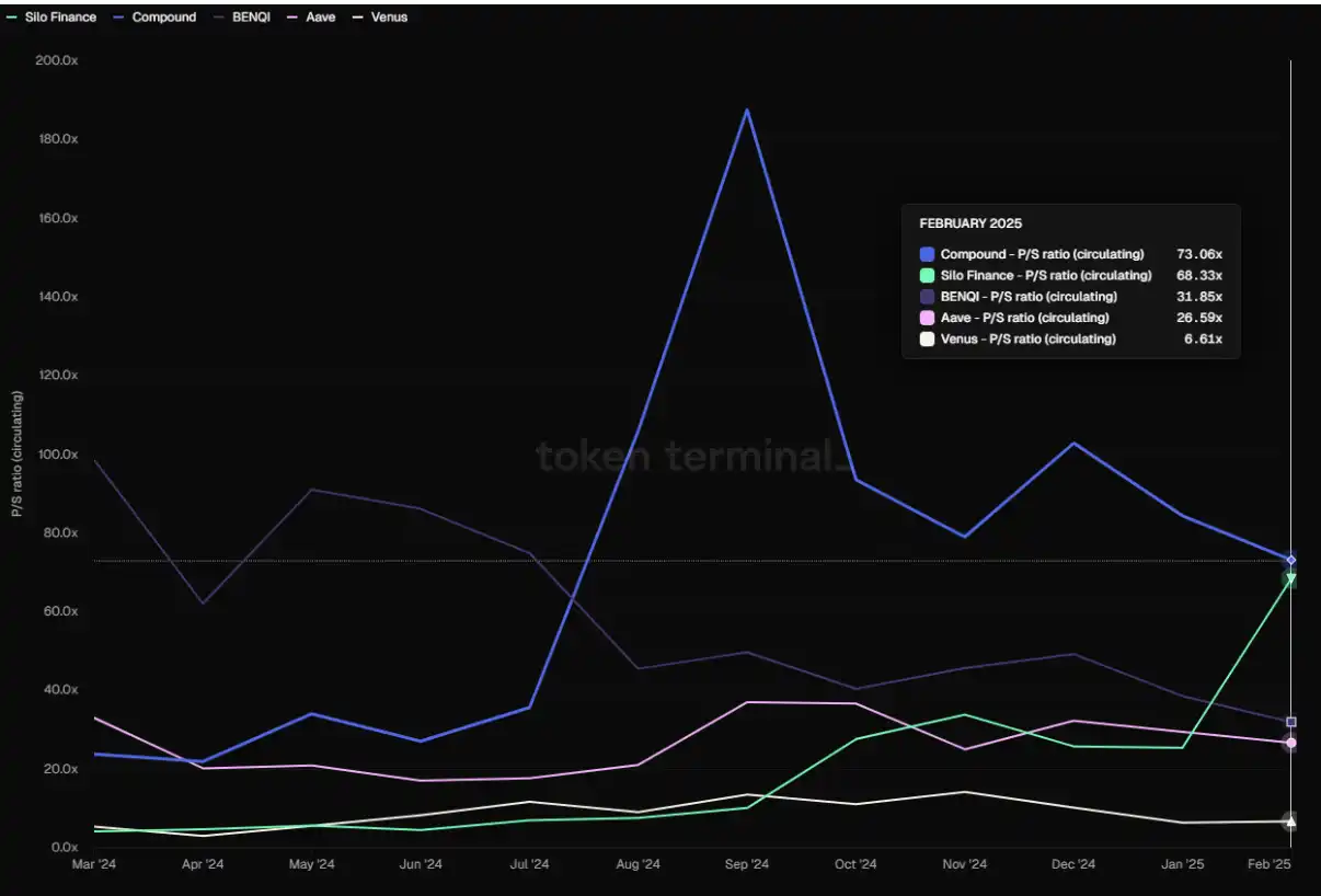 横向对比来看,Aave 的 PS 指标远低于 Compound、Silo、benqi 等协议,高于 Venus。