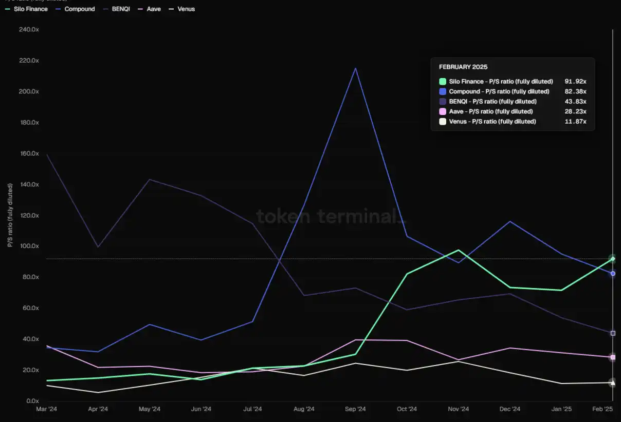 主流借贷协议的 PS(以 FDV 为基准),数据来源:Tokenterminal