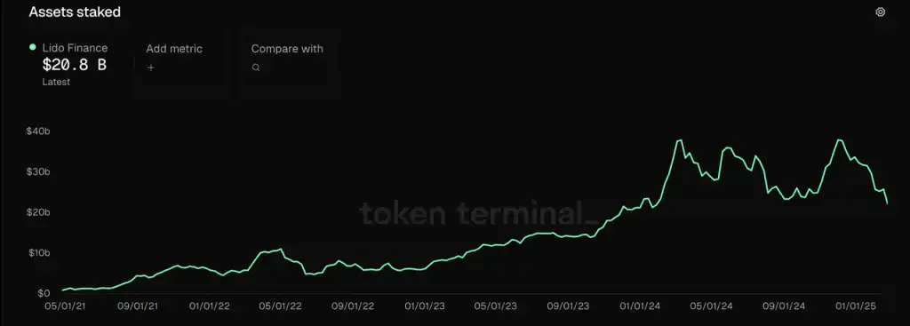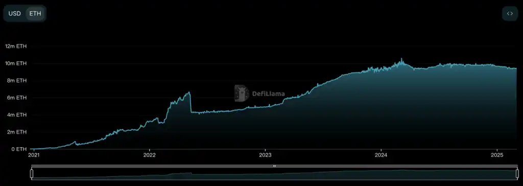 以 ETH 计算的 Lido 质押资产规模 来源:DeFillama