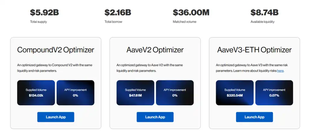 Morpho Optimizers 作为 Morpho 的初代产品,为其积累了大量用户和资金,让其后续推出 Morpho Blue 之后避免了从头冷启动。不过 Morpho Optimizers 尽管目前还有不少资金,但是其匹配功能带来的利率优化已经低到基本可以忽略,这款产品也不再是 Morpho 的发展重点,并从去年 12 月开始禁止再进行资金的存入和借出。