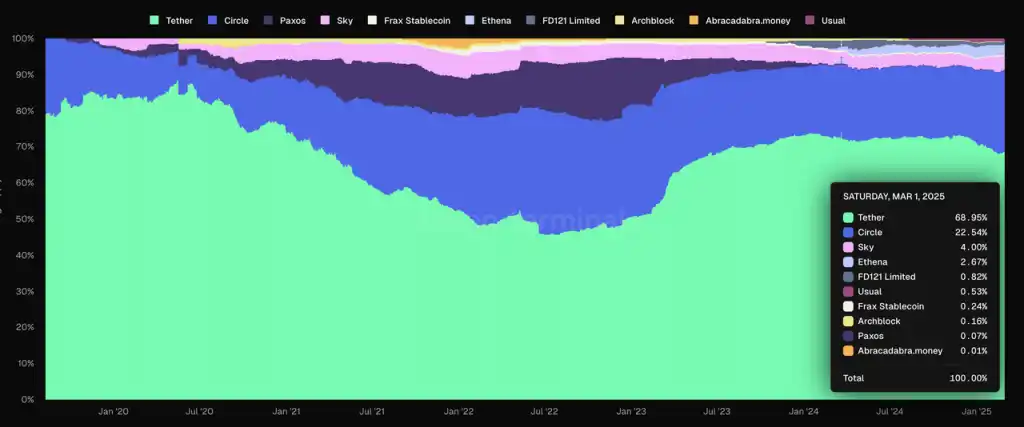 排名前十的稳定币的市场占比 来源:Tokenterminal