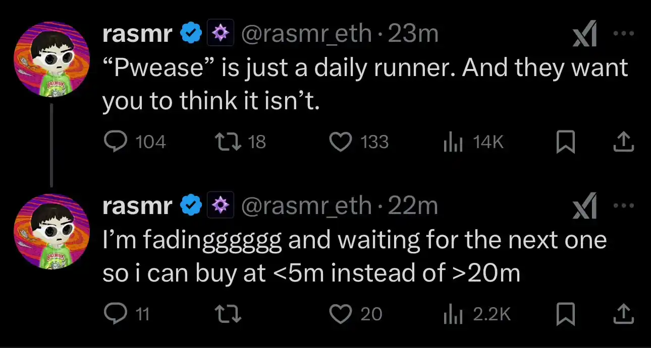 这究竟是极端行情下多日不见金狗的 Degen 集体 FOMO,还是一场代表背后理念冲突的文化运动,现在还不得而知。但是$PWEASE 确实是将市场的关注度从名人币转回了迷因文化的本质。当然以上内容皆非投资建议,极端行情请始终珍惜自己的筹码。