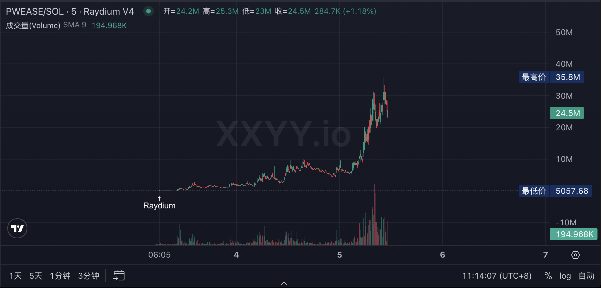在近期行情枯燥的情况下,Meme 的热潮也随之淡去了不少,在 Pump.fun3 月 3 日诞生的代币仅一个在 24 小时内市值依旧超过 100 万美元,这个优秀毕业生就是$PWEASE,经过两天的洗盘热度发酵后,市值最高达到了 3500 万美元,现报价 2500 万美元市值,他为什么能成为近期最强势的 Meme 呢?
