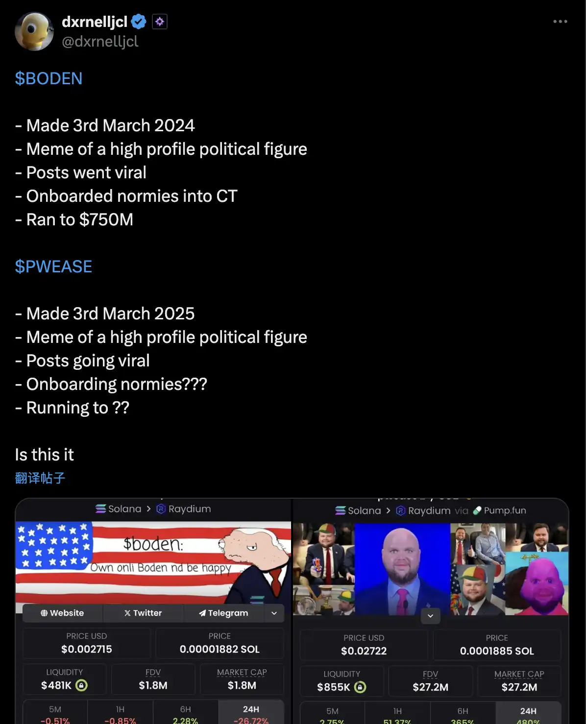 有不少人对$PWEASE 有很高的预期,将他与去年同期发行的$BODEN 进行类比,都同为政治人物的 Memecoin,一个是突出了前美国总统拜登的老头形象迷因化,另一个是将美国副总统万斯婴幼儿化,而$BODEN 跑到了 7 亿 5000 万市值,认为$PWEASE 也将会有不错的成绩。