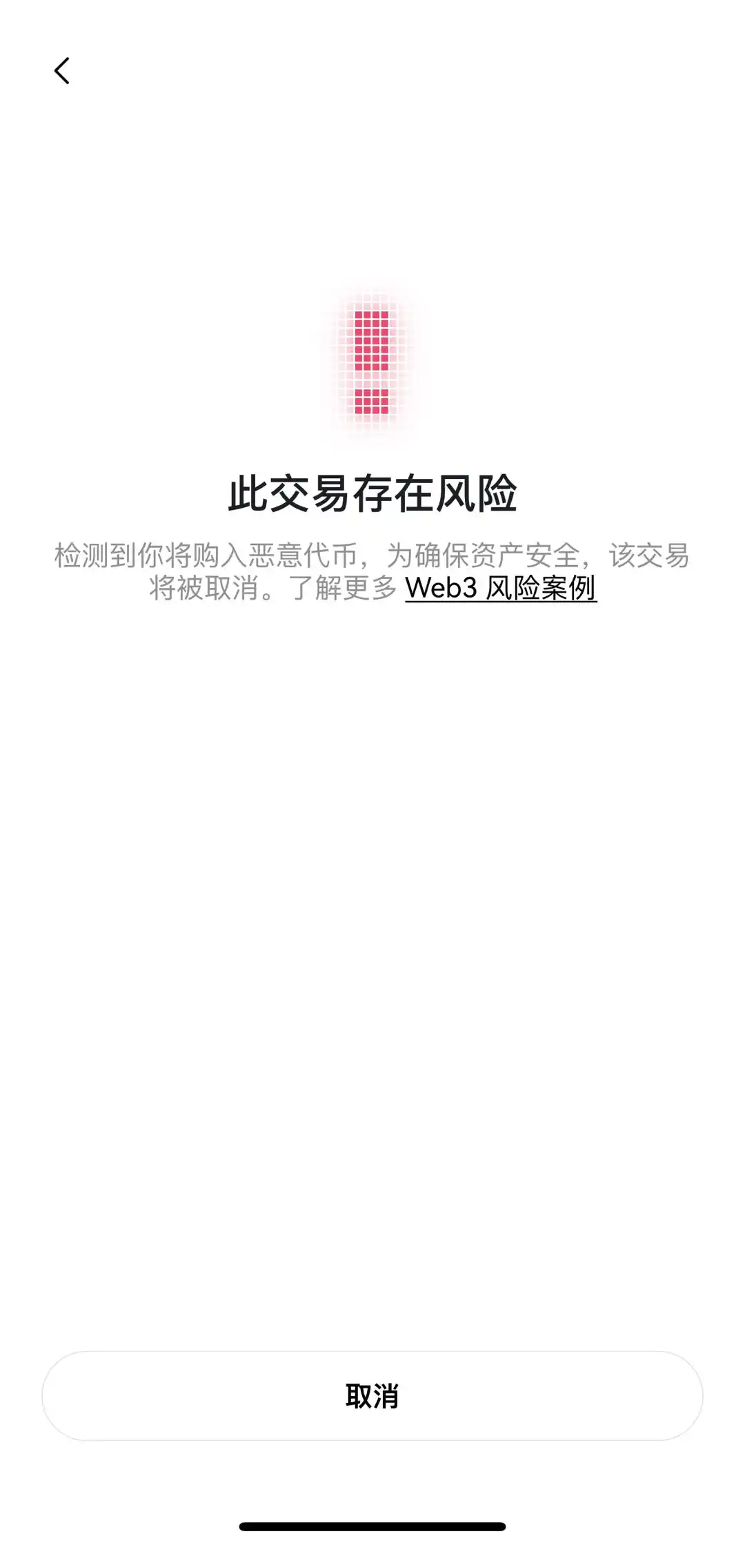 还有购买「恶意代币」。我来简单解释下,「恶意代币」可能内置后门或陷阱,例如无法出售或自动转移用户资产,我们购买后大概率导致资金损失。当我们尝试购买可疑代币时,OKX Web3 钱包会发出提示,并提供取消交易的选择,帮助用户避免落入代币诈骗的圈套。