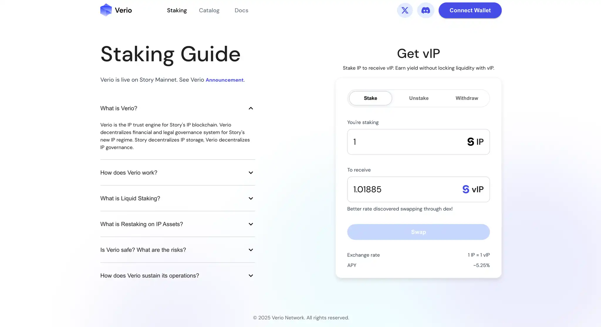 Verio 也是 IP 的流动性质押解决方案。你可以在 Verio 上将 IP 质押为 vIP,可提供更多灵活的质押选择,目前年化为 5.25%,根据 Defillama 数据,目前 Verio 的 TVL 为$12.82M。
